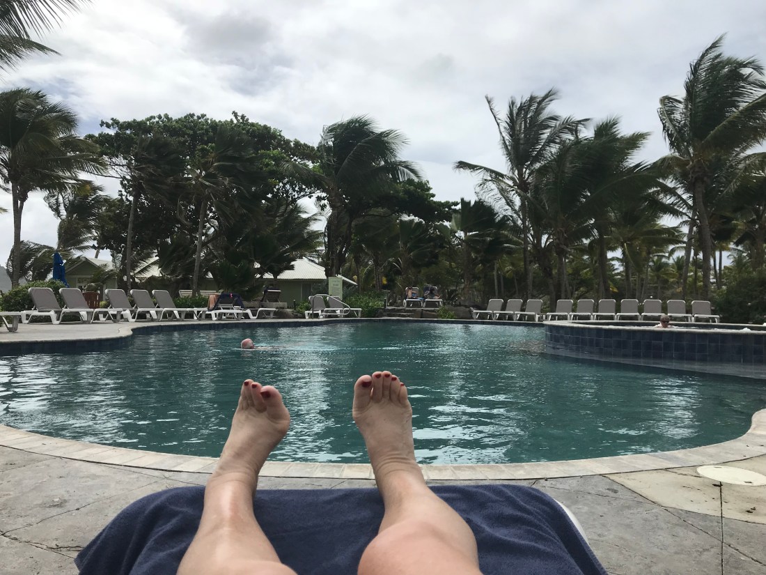 I cannot swim but we have a hot tub in the pool, just perfect in 80 degree heat, because the hot water gives me instant relief. Much like my fellow travellers seeking the coolness of the swimming pool I’m in the hot tub about 8 times a day just for some reprieve from the pain. I cannot reach the tub without my sticks which are fascinatingly now amphibious and have become as frequent a feature of the poolside furniture as cocktails, floats, and loungers.